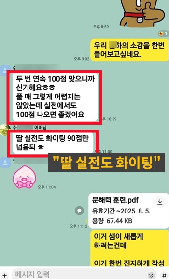 *실제 3>1등급달성 자녀를 실시간으로 확인 후 들어오는 톡입니다.
